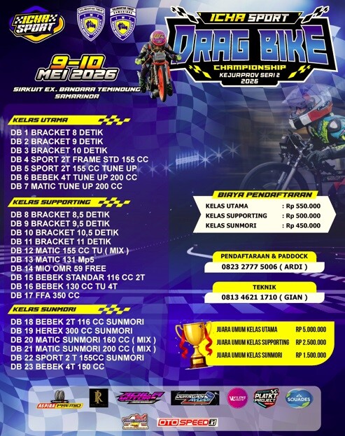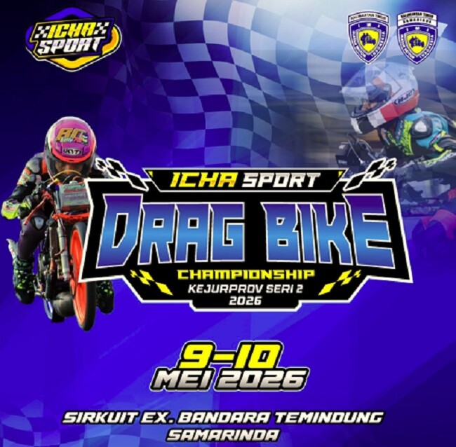 Otospeed.id – Samarinda. Ajang balap lurus bergengsi bertajuk ICHA SPORT Drag Bike Championship Kejurprov Seri 2 2026 dipastikan berlangsung pada 9–10 Mei 2026 di Sirkuit Ex Bandara Temindung, Samarinda, Kalimantan Timur. Event ini menjadi salah satu kejuaraan drag bike yang dinantikan para pecinta balap trek lurus di wilayah Kalimantan dan sekitarnya.