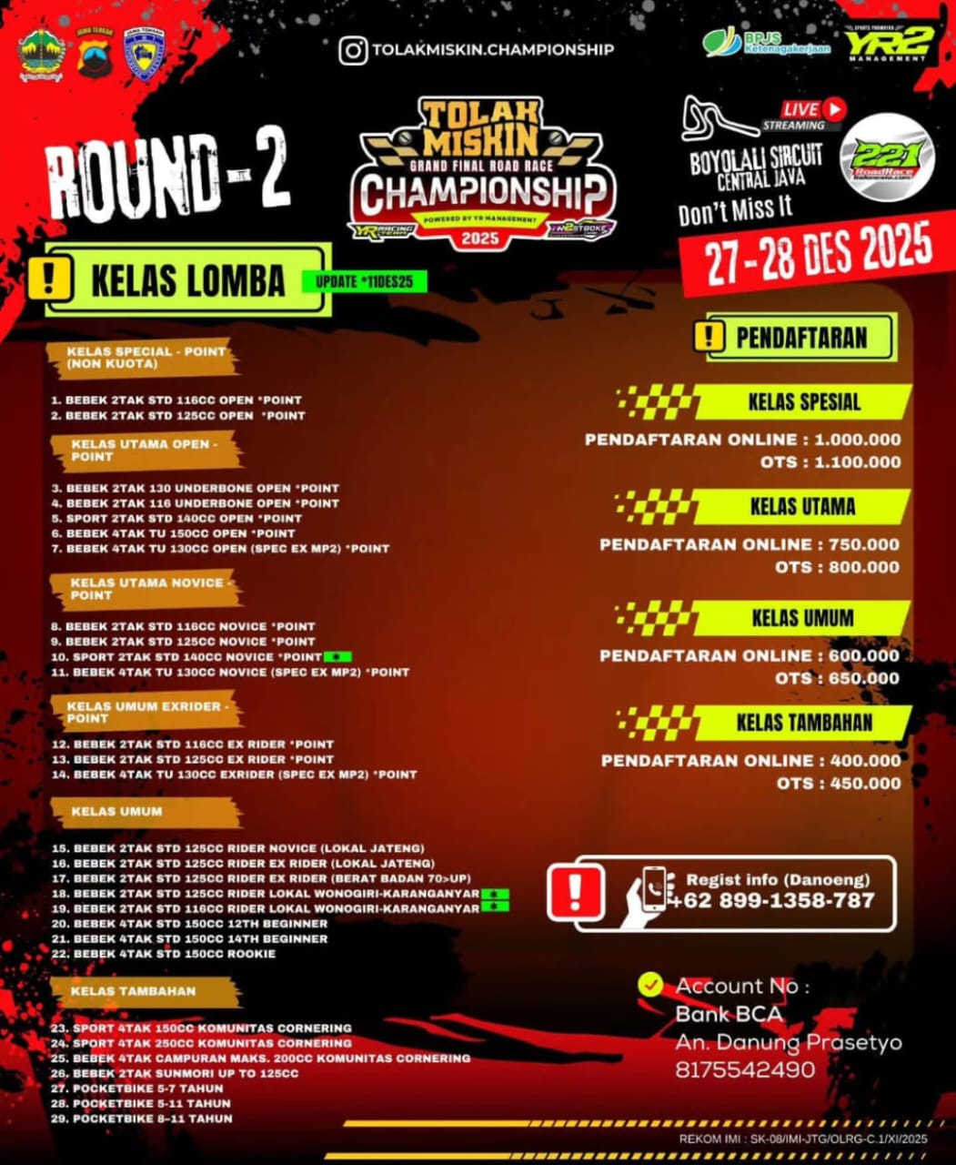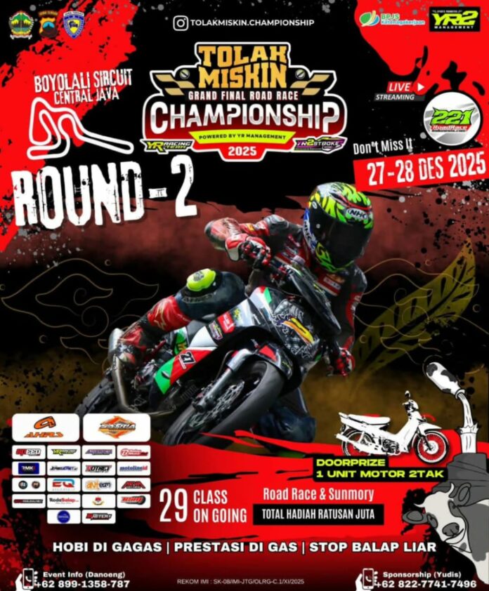 Dan inilah pembuktiannya, Grand Final Tolak Miskin Road Race Championship 2025 dipastikan akan digelar pada Hari Sabtu – Minggu 27-28 Desember 2025 mendatang di Sirkuit Go-kart Boyolali – Jateng. So.. waktu sudah dekat bolo… Segera siapkan kuda besi pacumu.. siapkan fisik dan nyalimu.. Segera daftarkan dirimu!! Sampai jumpa di sirkuit bolo… | BL@CK_DJ
