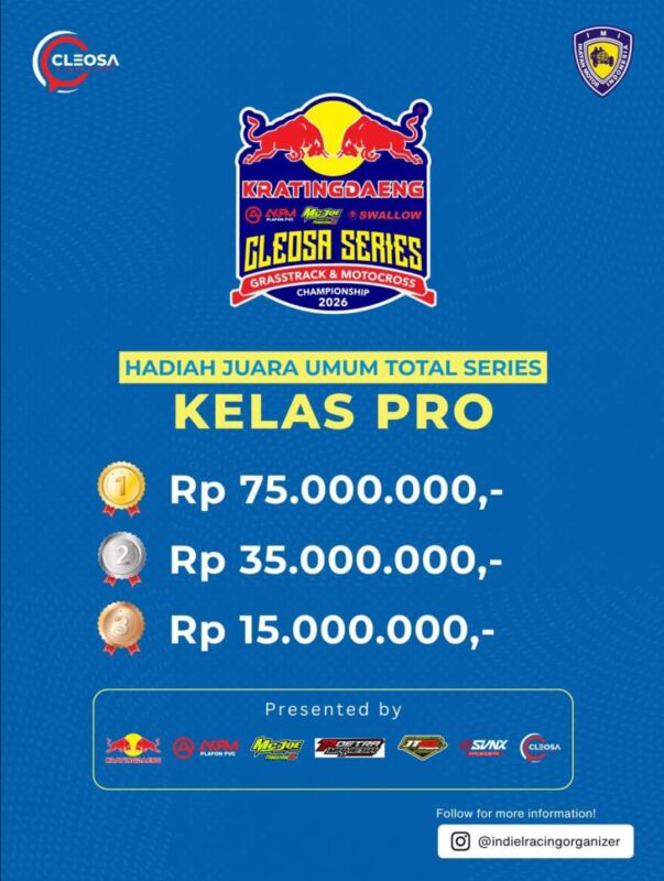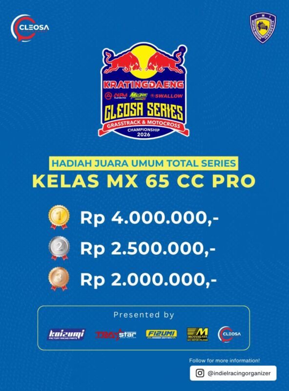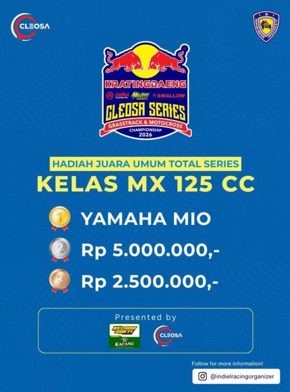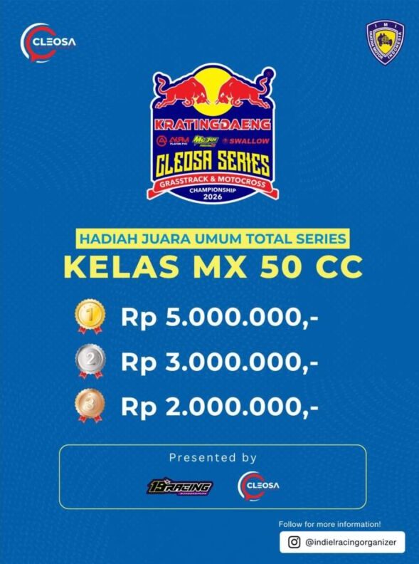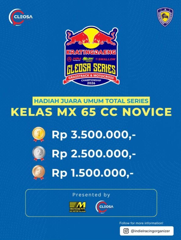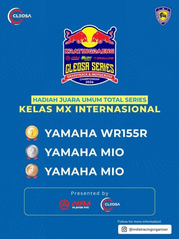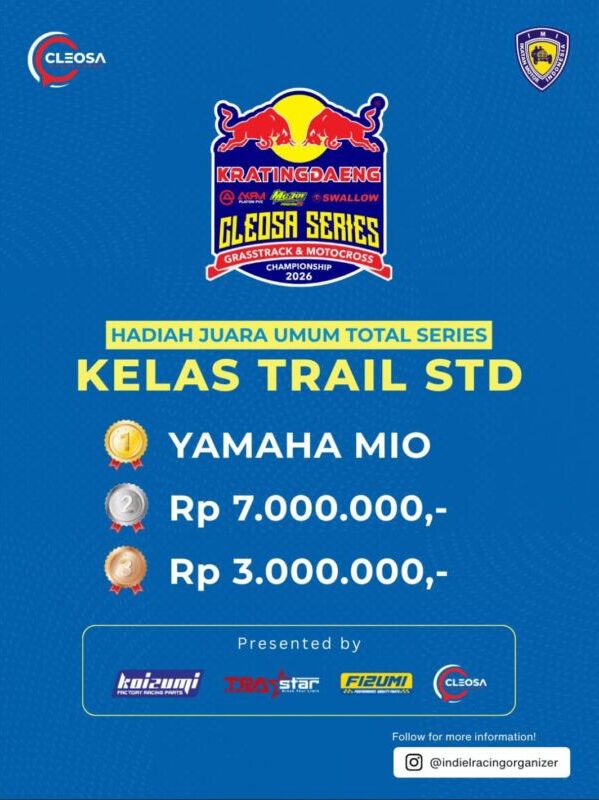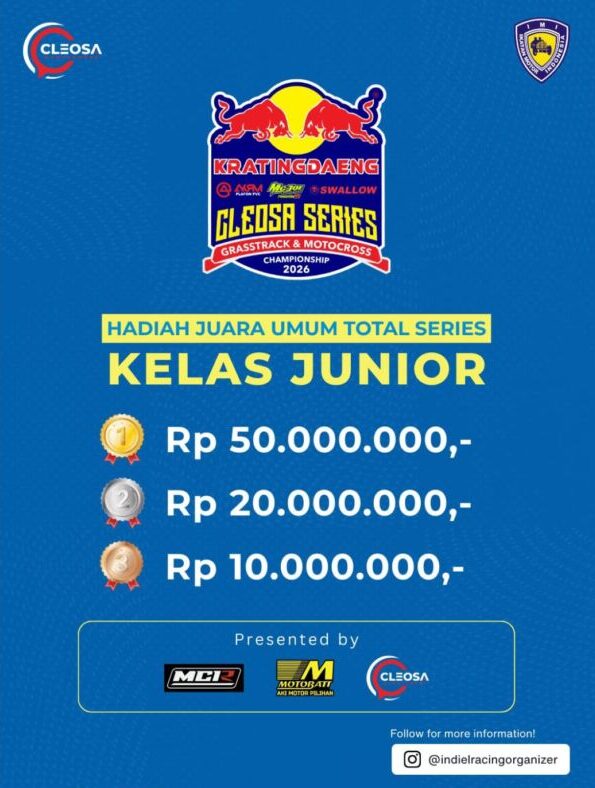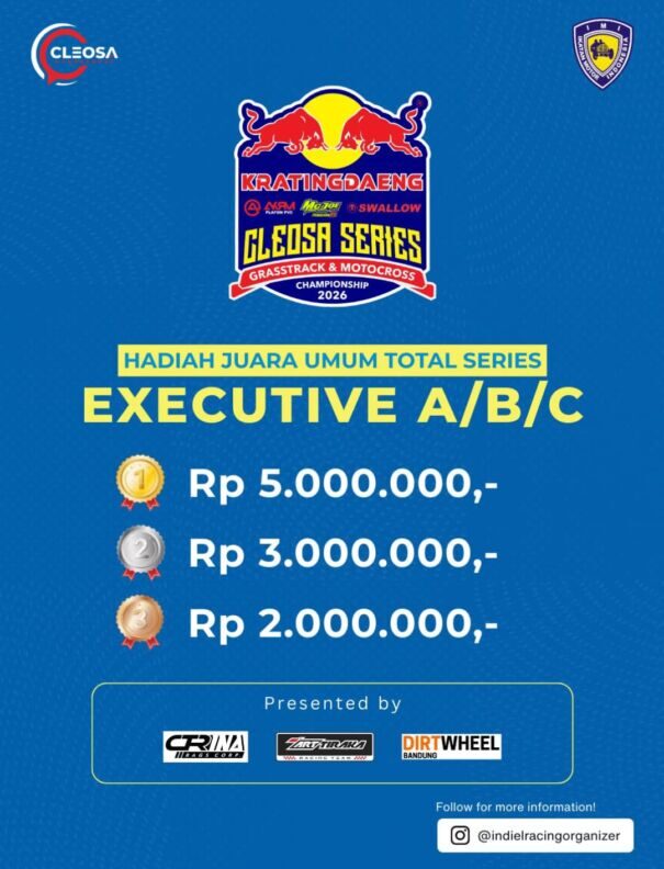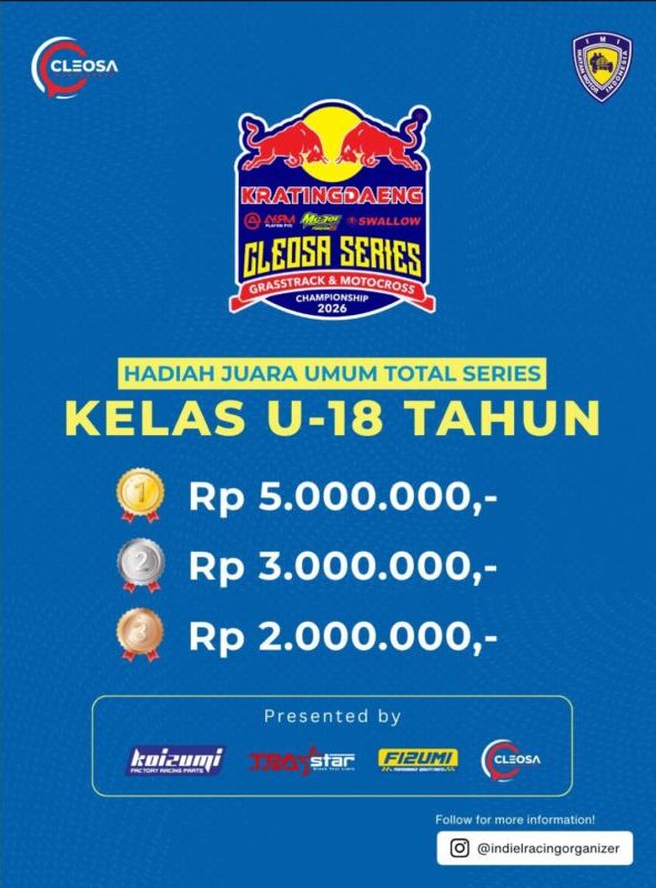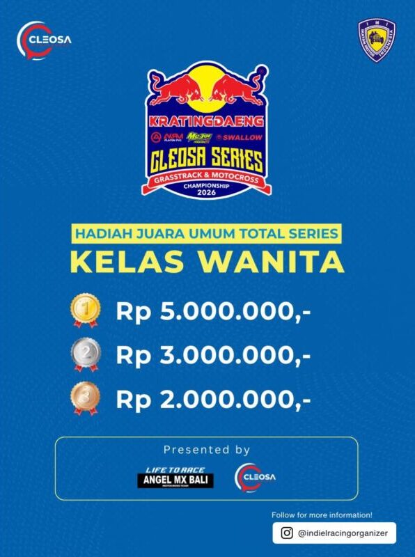 Otospeed.id – Yogyakarta. Kalau tahun lalu Cleosa Management memberikan hadiah mobil untuk juara umum Cleosa Series 2025, nah kali ini untuk Cleosa Series 2026 Juara Umum Total Series, hadiahnya bukan lagi mobil. Cleosa Management selaku promotor penyelenggara menggantinya dengan uang tunai puluhan juta rupiah.