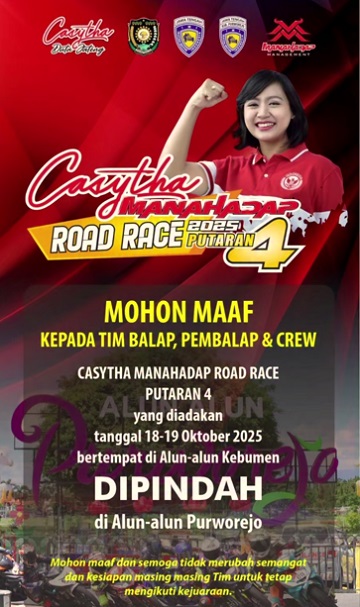 Otospeed.id – Purworejo. Speedlovers, gelaran Casytha Manahadap Road Race 2025 mengalami perubahan lokasi untuk putaran keempat. Jadwal awal, event dijadwalkan di Alun-alun Kebumen tanggal 18–19 Oktober 2025, namun adanya sesuatu hal, pihak penyelenggara memutuskan memindahkan ke lintasan NP Alun-alun Purworejo dengan jadwal yang tetap sama.