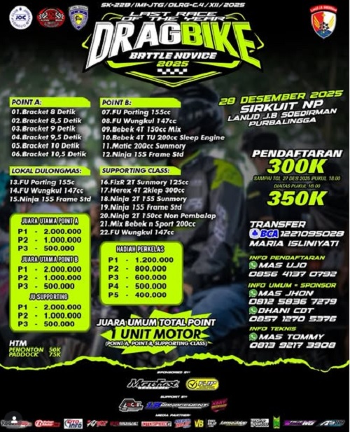 Otospeed.id – Purbalingga. Speedlovers pecinta trek lurus, akhir tahun 2025 di Purbalingga tepatnya di Sirkuit NP Lanud JB Soedirman tanggal 28 Desember. Kejuaraan Drag Bike dengan title “Last Race Of The Year Drag Bike Battle Novice 2025” bakal menjadi saksi siapakah yang akan menjadi dragbiker sejati.