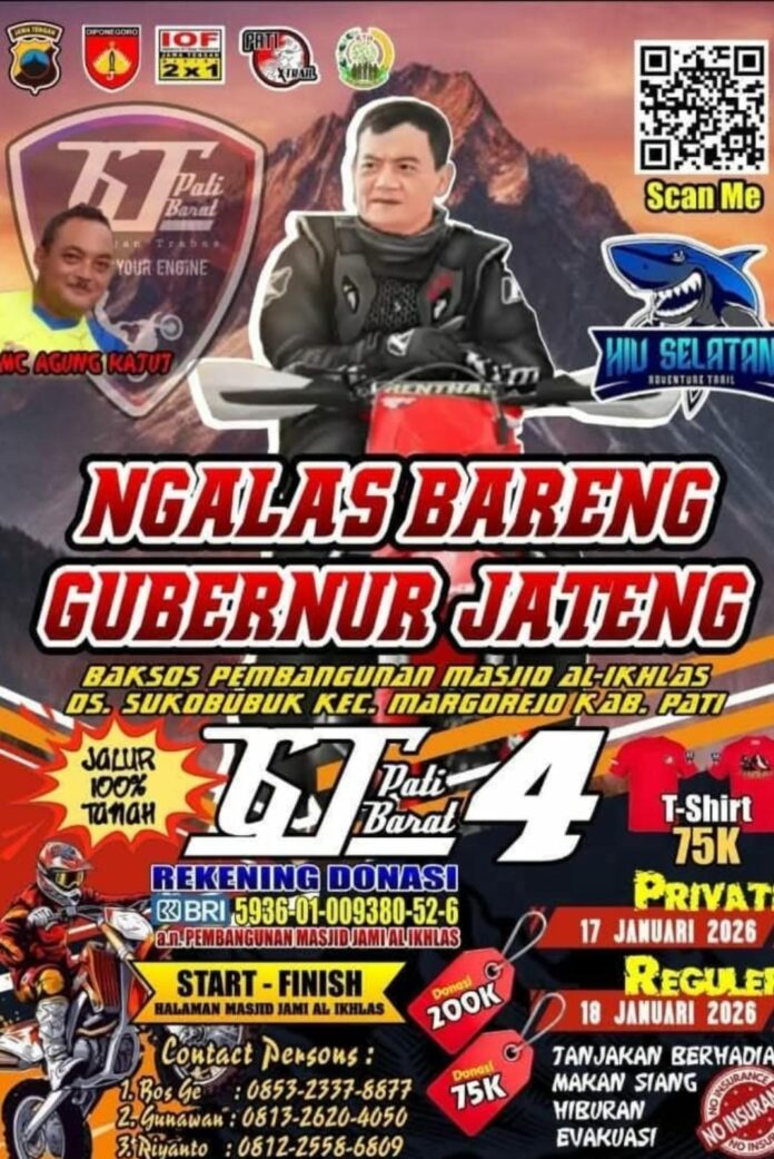 Otospeed.id – Pati. Membuka awal 2026, GT Pati Barat Pati X Trail, komunitas yang mewadahi pehobi trail adventure Pati dan sekitarnya yang berada dibawah naungan IOF Pengcab Pati, bakal menggelar bakti sosial penggalangan dana melalui event trail adventure yang bertajuk Ngalas Bareng Gubernur Jateng.