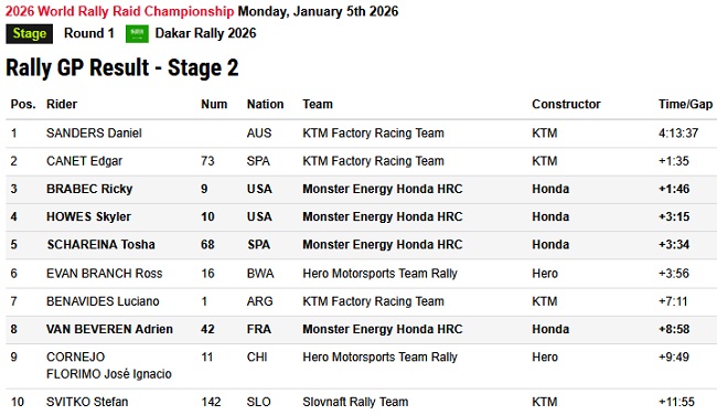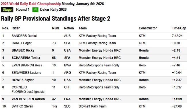 Skyler Howes mencatat progres impresif setelah crash di stage pertama. Pembalap Amerika itu finis keempat dan kini naik ke posisi tujuh klasemen.