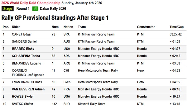 Adrien Van Beveren menghadapi kendala teknis berupa hilangnya rem depan sejak awal lomba, namun tetap mampu menyelesaikan stage di posisi kedelapan. Sementara itu, Skyler Howes bangkit dari insiden crash akibat debu tebal dan finis di urutan kesembilan.