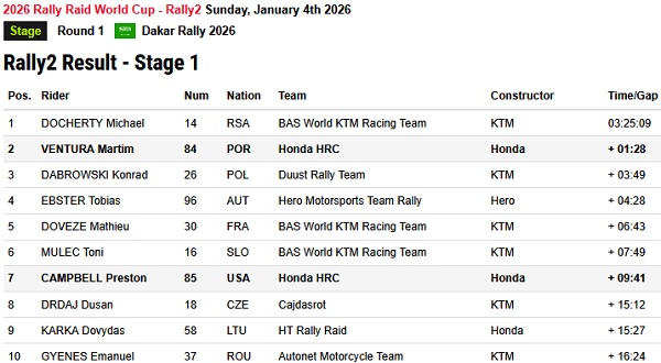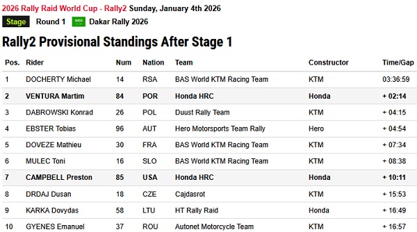 Sementara itu, Preston Campbell mencatat hasil positif di etape penuh pertamanya di Dakar Rally. Pebalap asal Amerika Serikat ini finis di posisi ketujuh dan bertekad memangkas selisih waktu dari pemuncak klasemen seiring berjalannya reli. Selanjutnya, Dakar Rally akan berlanjut menuju AlUla dengan rute pegunungan menantang sepanjang 400 km. |OS