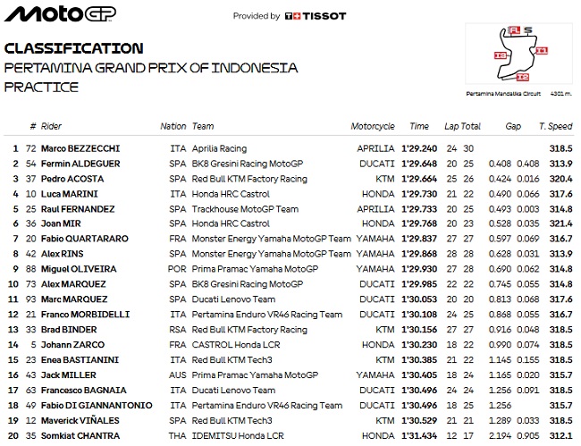 Otospeed.id – Mandalika. Berikut hasil free practice MotoGP 2025 yang berlangsung di Sirkuit Mandalika Lombok, NTB (3/10). |OS