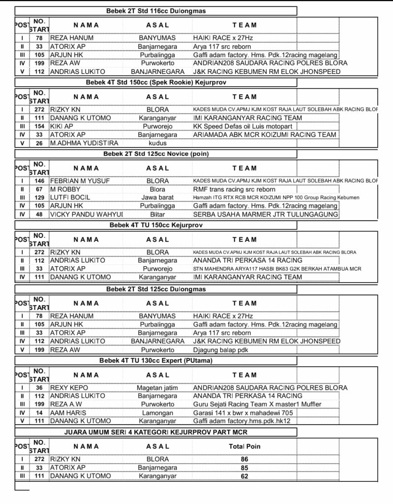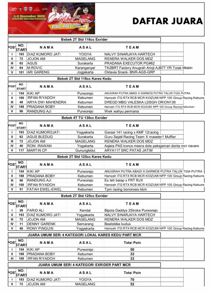 Otospeed.id – Purworejo. Speedlovers pecinta balap road race sebangsa dan setanah air, perhelatan kejuaraan balap road race Casytha Manahadap Putaran yang ke-4 yang digelar di Sirkuit Non Permanen Alun-Alun Purworejo pada Hari Sabtu – Minggu, 1-2 November 2025 telah usai diselenggarakan dengan sukses.