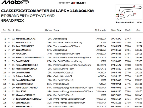 Kemenangan ini sekaligus mencatatkan hat-trick bersejarah bagi Aprilia Racing setelah sebelumnya Bezzecchi menang di Portugal dan Valencia pada akhir musim 2025.