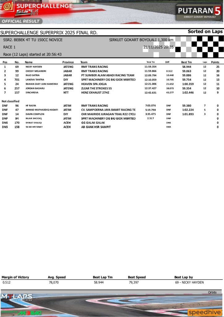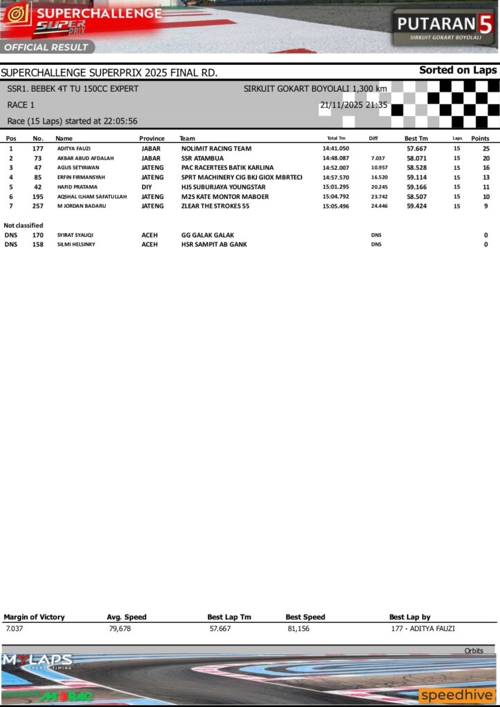 Otospeed.id – Boyolali. Speedlovers pecinta balap road race sebangsa dan setanah air. Gelaran Grand Final Superprix 2025 hari yang pertama telah usai. Hari ini dilaksanakan QTT untuk penentuan posisi grid start dan dua race 1. Dan berikut adalah hasil race 1 Kelas 4T TU 150 Ekxpert dan 4T TU 150 Novice. | BL@CK_DJ