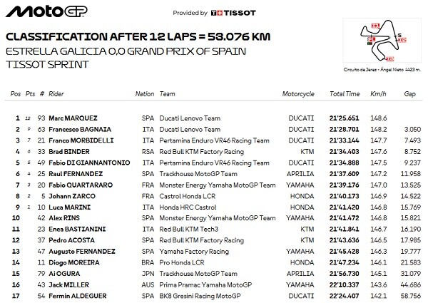 Francesco Bagnaia sempat memimpin setelah pergantian motor, namun Marc Marquez berhasil menyalip kembali dan mengunci kemenangan. Dari posisi sempat turun hingga P17, Marquez bangkit ke P1 dan menutup Sprint dengan hasil luar biasa.