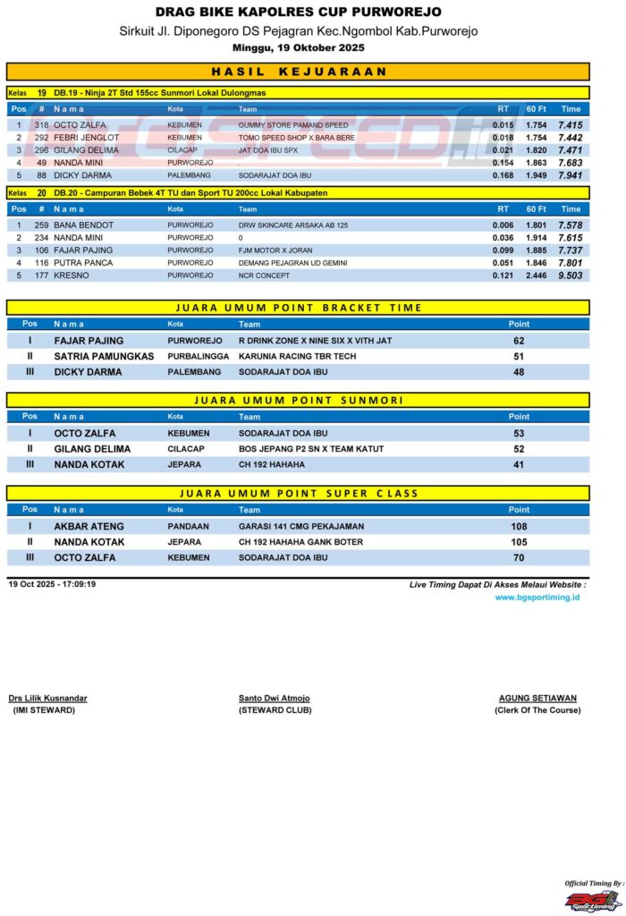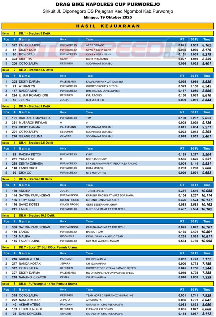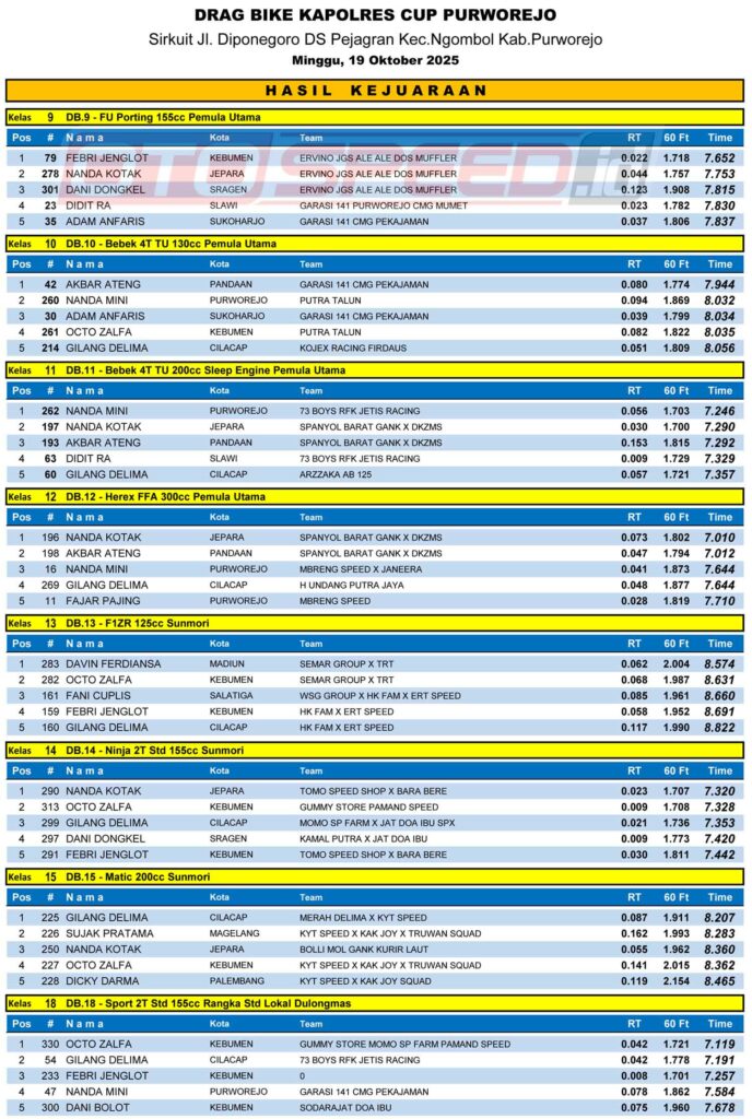 Otospeed.id – Purworejo. Speedlovers, berikut hasil kejuaraan ajang adu cepat 201 meter bertajuk Dragbike Kapolres Cup Purworejo 2025 yang berlangsung di Sirkuit Jl. Diponegoro, Desa Pejagran, Kecamatan Ngombol, Kabupaten Purworejo tanggal 19 Oktober. OS1