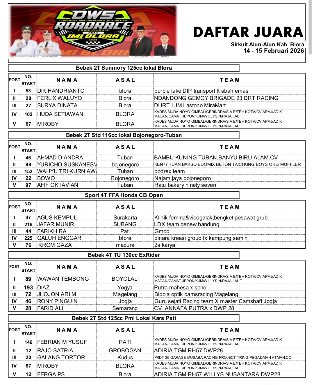 Otospeed.id – Blora. Speedlovers pecinta balap road race sebangsa dan setanah air.. Gelaran balap yang bertajuk DWS Road Race Championship 2026 yang bekerjasama dengan IMI Kabupaten Blora telah usai dan sukses digelar selama dua hari.
