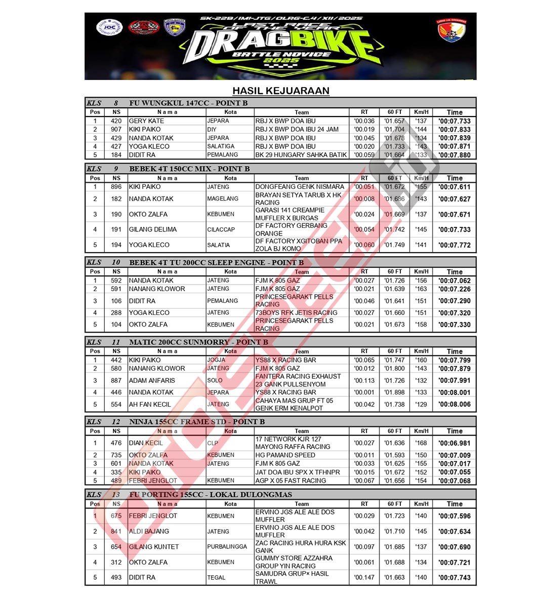 Dan berikut adalah hasil resmi kejuaraan yang telah dirilis oleh 38 Timing System selaku official timing system Last Race Off The Year Battle Novice 2025. | BL@CK_DJ