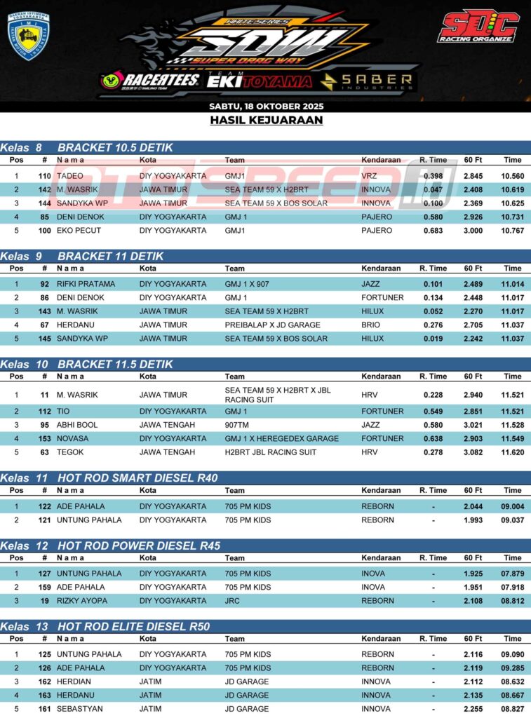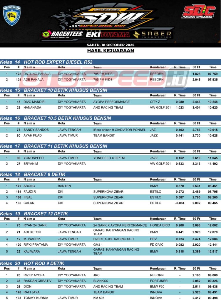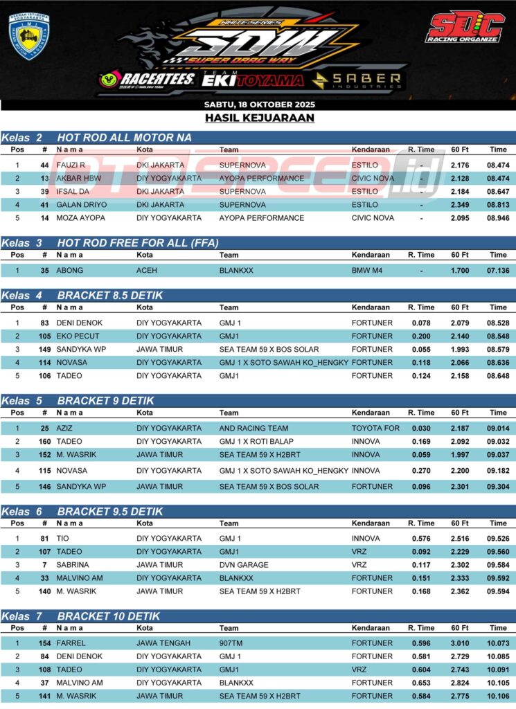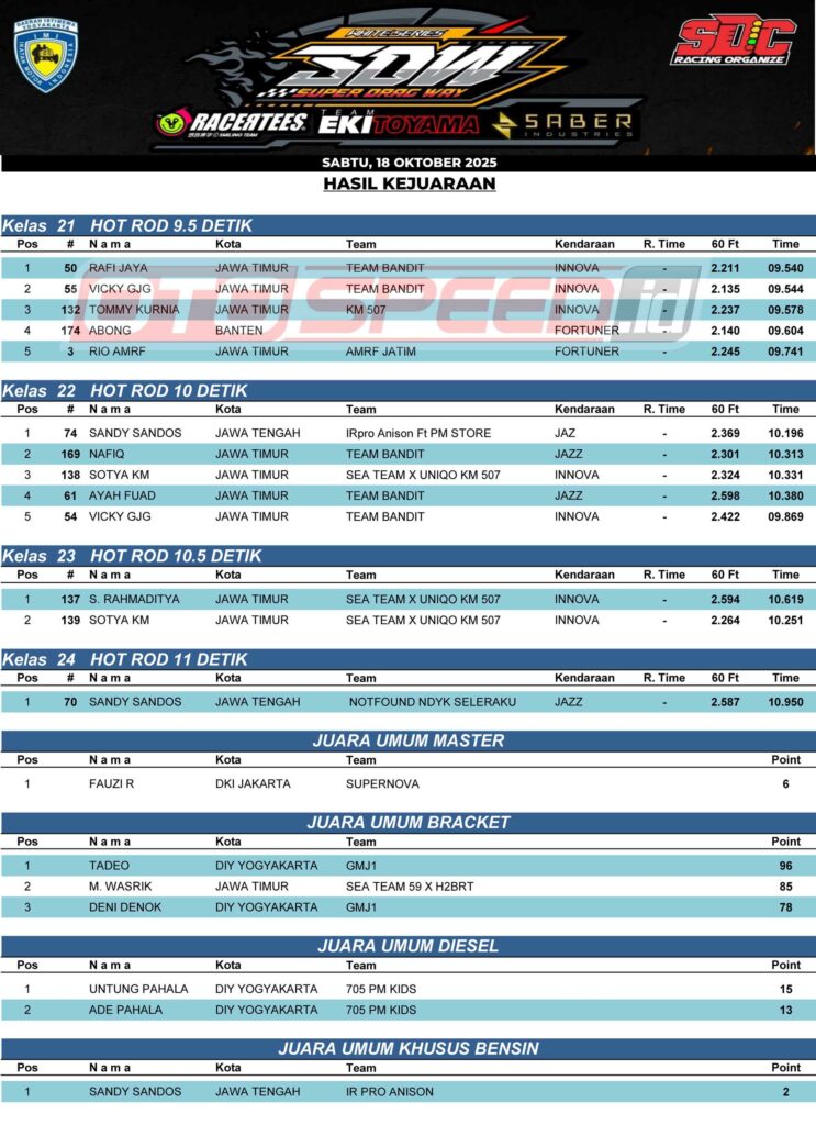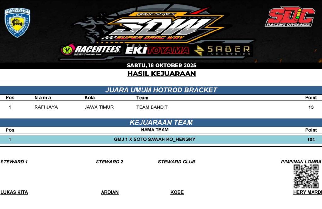 Otospeed.id – Wonosari. Speedlovers pecinta balap adu kebut lurus sebangsa dan setanah air, berikut hasil lengkap kejuaraan Super Drag Way (SDW) Drag Race 2025 yang digelar di Sirkuit Non Permanen (NP) Lanud gading Wonosari, Gunung Kidul, Yogyakarta pada Sabtu (18/10) lalu. OS1