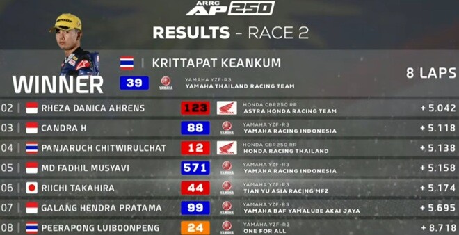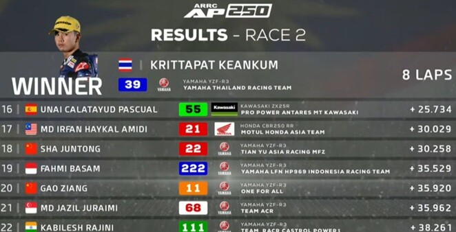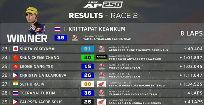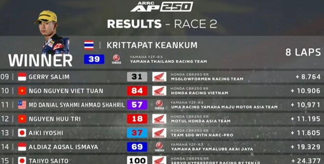 Balapan ini memperlihatkan dominasi sekaligus konsistensi para pembalap Asia Tenggara dan Jepang, dengan selisih waktu yang relatif ketat antar posisi. Strategi, ketahanan fisik, dan performa mesin menjadi faktor penentu dalam perebutan podium.