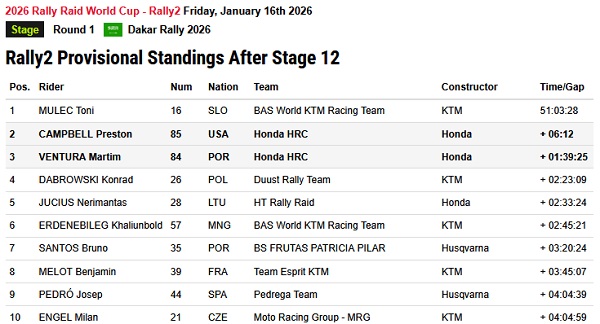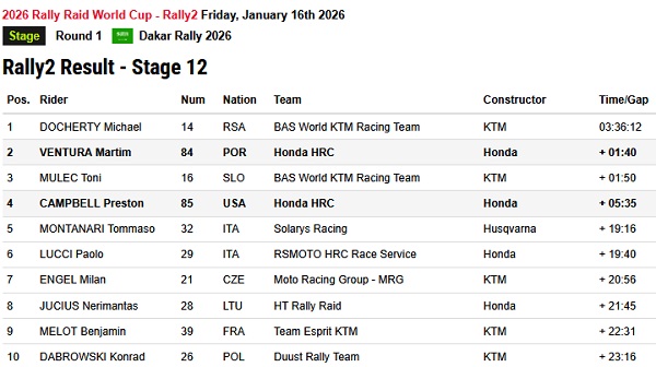 Hasil Stage 12 Dakar Rally 2026 : Campbell dan Ventura Pertahankan Peluang Podium