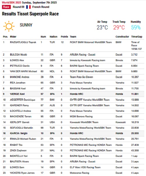 Sementara itu, García menjalani debut WorldSBK yang mengesankan. Pada Superpole Race, ia start dari posisi 19. Meski sempat terjatuh ke posisi paling belakang akibat kontak dengan pebalap lain di tikungan 2, García bangkit dan menunjukkan kecepatan kompetitif. Ia berhasil menyalip beberapa pebalap dan finis di posisi 16.