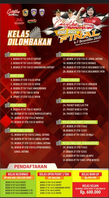 Otospeed.id – Karanganyar. Speedlover, gelaran Casytha Manahadap Road Race 2025 memasuki Final Round, dan seluruh mata pecinta balap motor di Tanah Air kini tertuju pada Sirkuit Non Permanen (NP) Alun-alun Karanganyar yang akan menjadi saksi pertarungan terakhir para pembalap terbaik pada 6–7 Desember 2025. Event bergengsi ini dipastikan menghadirkan adrenalin, gengsi, serta persaingan ketat antar pembalap dari berbagai daerah.