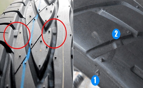 Tarik garis lurus dari tanda segitiga ke arah telapak ban. Di dalam sela alur, ada tonjolan kecil.