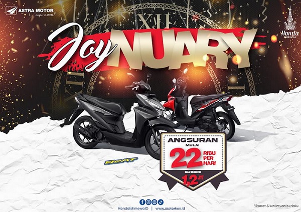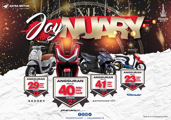 Program penjualan JOYNUARY memberikan kombinasi subsidi harga serta skema angsuran ringan bagi konsumen yang melakukan pembelian motor Honda selama bulan Januari. Promo ini berlaku di 78 dealer resmi Astra Motor Yogyakarta yang tersebar di 14 kabupaten di tiga wilayah tersebut.