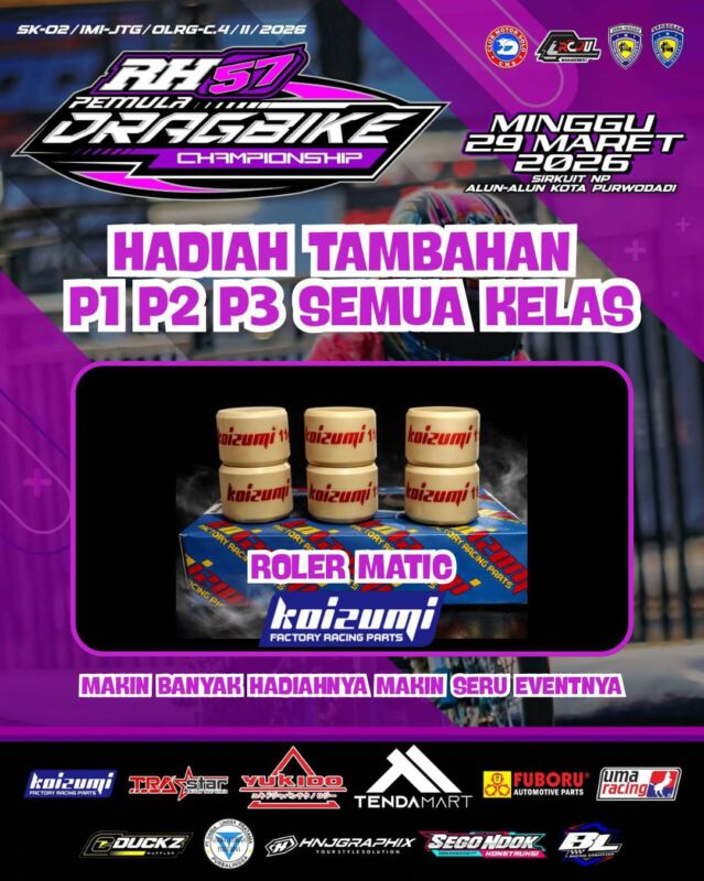 Otospeed.id – Purwodadi. Komitmen Koizumi dan TRAstar sebagai brand racing part terhadap perkembangan kemajuan balap tanah air makin terlihat jelas dengan dukungan penuh yang diberikan pada event RH57 Pemula Drag Bike Championship 2026 yang digelar di Sirkuit Non Permanen Alun-Alun Kota Purwodadi, Minggu (29/3) ini.