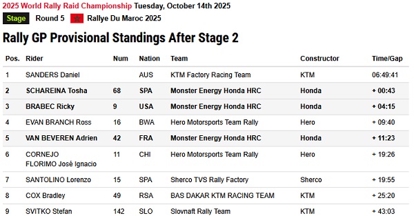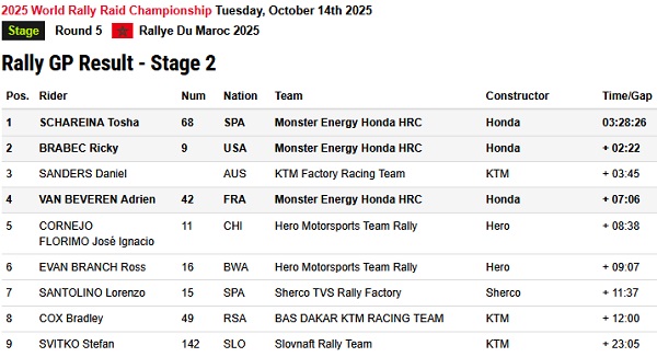 Rekan setimnya, Ricky Brabec, yang sebelumnya kehilangan waktu di etape pertama, menemukan ritme terbaiknya setelah melakukan beberapa penyetelan pada motor Honda CRF450 RALLY. Ia finis di posisi kedua, terpaut 2 menit 22 detik dari Schareina, sekaligus naik ke peringkat ketiga klasemen keseluruhan.