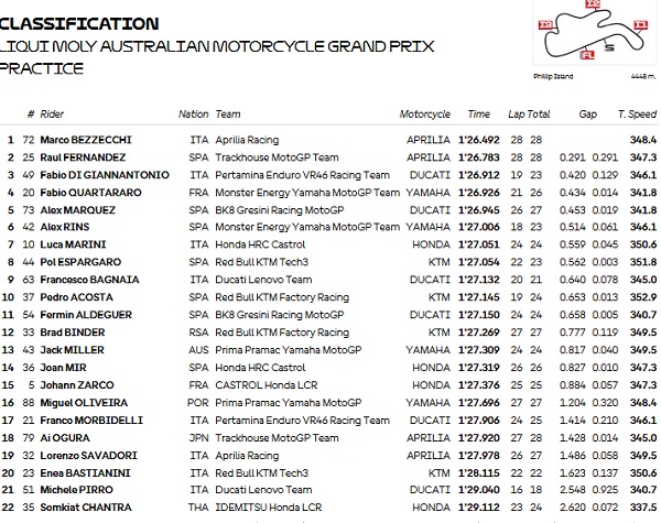 Namun, dengan lap terbaiknya di penghujung sesi, Bagnaia berhasil mencatat 1:27.132 dan naik ke posisi sembilan — cukup untuk lolos otomatis ke Q2.