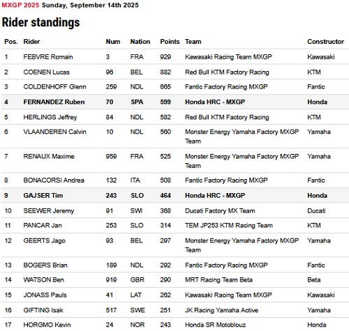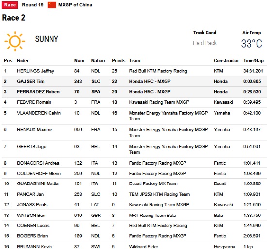 Sementara itu di kelas MX2, Valerio Lata juga memperlihatkan hasil menjanjikan dengan finis kelima di moto pertama. Sayangnya, di moto kedua ia mengalami insiden tabrakan dengan pembalap lain yang merusak motornya sehingga hanya mampu finis ke-11. Secara total, Lata menutup balapan di posisi kedelapan. Meski begitu, hasil ini tetap jadi modal penting bagi pembalap Italia tersebut untuk tampil lebih percaya diri di putaran terakhir kejuaraan di Australia. |OS