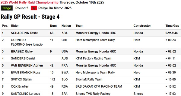 Setelah kehilangan waktu di awal, Schareina bangkit dengan kecepatan luar biasa dan menebus ketertinggalannya menjelang akhir etape. Hasilnya, ia finis tercepat dan kini unggul 3 menit 33 detik atas Daniel Sanders di klasemen umum.