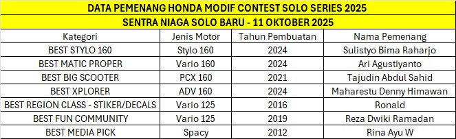 “Selamat kepada seluruh pemenang dan selamat beradu di Final Contest pada Honda Bikers Day di Garut pada 15 November mendatang. Kami percaya modifikator Jateng – DIY pasti bisa keluar sebagai pemenang Nasional tahun ini,” ucap Henry mendukung para kontestan modifikator yang mewakili HMC Solo Series 2025. | And