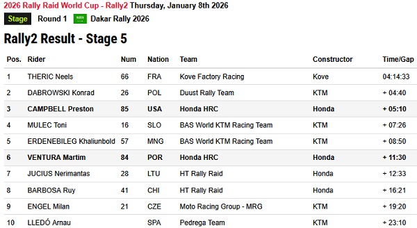 Rekan satu timnya, Martim Ventura, menghadapi malam panjang memperbaiki Honda CRF450RX RALLY. Ia finis keenam etape ini dan naik ke posisi kedelapan klasemen, sambil terus mengumpulkan pengalaman berharga di Dakar perdananya.
