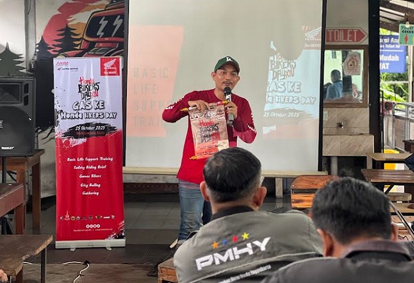 Instruktur PMI, Raya Rusavandi, memperkenalkan sistem Public Safety Center (PSC) serta mengajarkan teknik Resusitasi Jantung Paru (RJP) dan pembidaian tulang — keterampilan vital yang bisa menjadi penentu keselamatan di jalan. Sebagai puncak kegiatan, Mabel Butar-Butar, PIC Community Astra Motor Yogyakarta, memaparkan berbagai informasi teknis mengenai Honda Bikers Day 2025, mulai dari tata cara registrasi, layout lokasi, hingga rekomendasi rute menuju Garut.