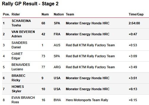 Van Beveren sendiri tampil konsisten dan finis kedua meski sempat mengalami kendala teknis, sekaligus memperkuat posisinya di klasemen sementara. Sementara itu, Ricky Brabec finis keenam setelah sempat terjatuh, dan Skyler Howes menempati posisi ketujuh dengan pendekatan balap yang lebih aman di kondisi lintasan basah.