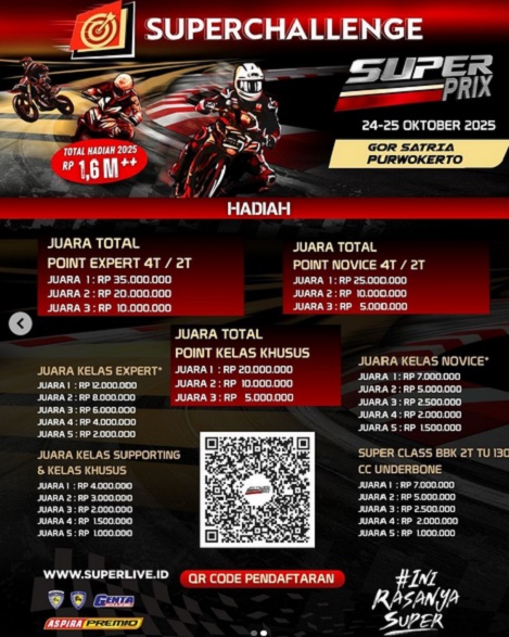 Super Prix 2025 kembali memanjakan para peserta dengan total hadiah fantastis mencapai Rp 1,6 miliar+. Para juara di kategori Expert, Novice, Kelas Khusus, dan Supporting akan mendapatkan penghargaan besar sesuai hasil poin yang dikumpulkan sepanjang musim.