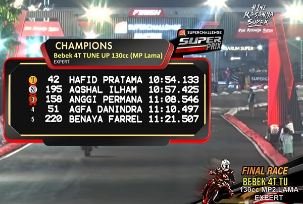 Otospeed.id – Purwokerto. Aksi luar biasa kembali diperlihatkan oleh Hafid Pratama di ajang Superchallenge Superprix 2025 Putaran 4. Pebalap muda penuh talenta itu sukses menjadi juara kelas Bebek 4T Tune Up 130cc (MP Lama) Expert, setelah menorehkan waktu impresif 10 menit 54,133 detik di final race yang berlangsung penuh tensi dan adrenalin.