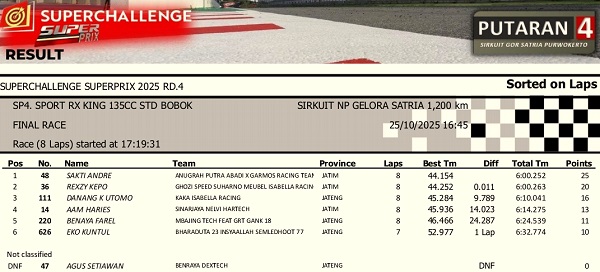 Otospeed.id – Purwokerto. Sakti Andre tampil gemilang dan berhasil meraih kemenangan pada kelas Sport RX King 135cc STD Bobok dalam ajang Superchallenge Superprix 2025 Putaran 4 yang berlangsung di Sirkuit Non Permanen Gelora Satria, Purwokerto. Pebalap asal Jawa Timur yang memperkuat Anugrah Putra Abadi XGarmos Racing Team ini menunjukkan performa konsisten sepanjang balapan dan sukses finis terdepan setelah delapan lap penuh persaingan ketat.