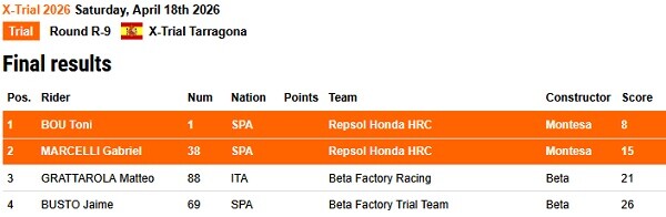 Pada final, Marcelli mempertahankan performa kompetitif meski belum mampu menyaingi Bou. Ia akhirnya finis kedua di Tarragona, hasil yang cukup untuk menggeser Jaime Busto dan memastikan posisi runner-up klasemen akhir musim. Dengan kemenangan Bou dan posisi kedua Marcelli, Repsol Honda HRC sukses mengunci hasil satu-dua di klasemen akhir X-Trial 2026. Toni Bou keluar sebagai juara dunia, sementara Marcelli menutup musim sebagai runner-up.