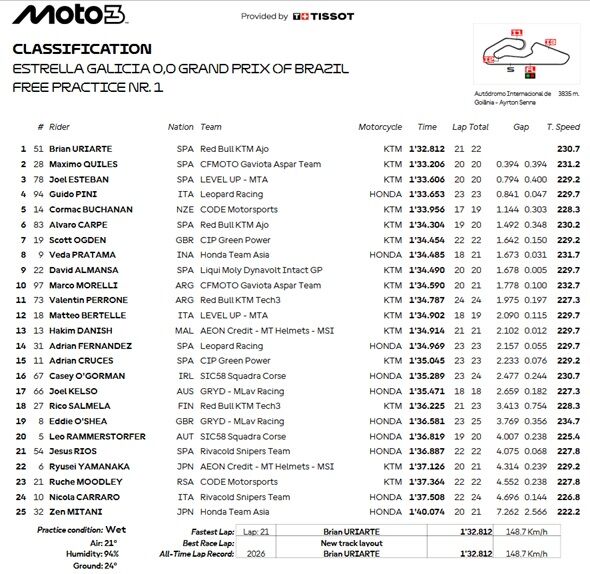 Sesi FP1 yang berlangsung di Sirkuit Ayrton Senna, Goiania, harus diawali dengan penundaan selama satu jam akibat hujan deras yang mengguyur sejak pagi. Trek yang basah membuat para pembalap lebih berhati-hati, sekaligus memanfaatkan sesi ini untuk memahami karakter lintasan.