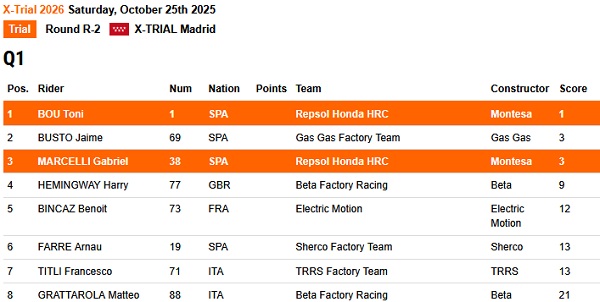 Datang ke Madrid dengan motivasi tinggi untuk menebus hasil tahun lalu, Toni Bou tampil begitu dominan sejak lap pertama. Ia hanya mencatat satu poin penalti, langsung memastikan tempat di Grand Final. Pada sesi Super Section, Bou menjadi yang tercepat dengan waktu 32 detik, membuatnya berhak memulai sebagai pembalap terakhir di tahap paling menentukan malam itu.